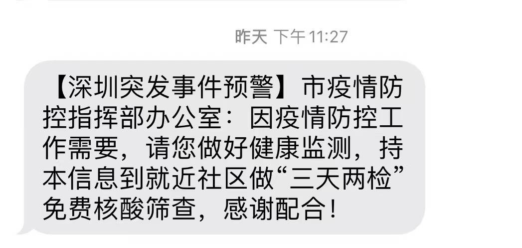 【深圳通知】您已接收到核酸检测通知短信,请您按照指示,尽快前往指定地点进行核酸检测。为确保健康安全,请您务必配合,感谢您的理解与配合。...